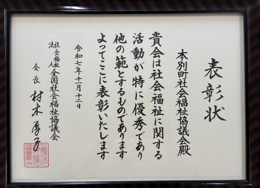 令和7年11月12日、東京都の浅草公会堂で開催された令和7年度全国社会福祉大会において、本別町社会福祉協議会が全国社協会長表彰(社協優良活動表彰)を受賞しました。