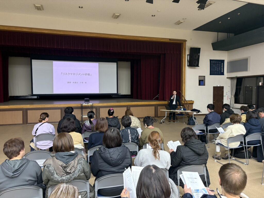 講師には、札幌市の弁護士法人リブラ共同法律事務所の弁護士、小泉純先生をお迎えし、「リスクマネジメント・法律基礎研修」と題して1時間超のご講演をいただきました。